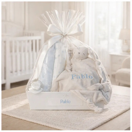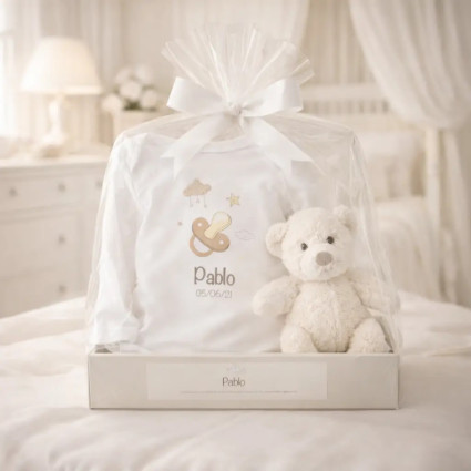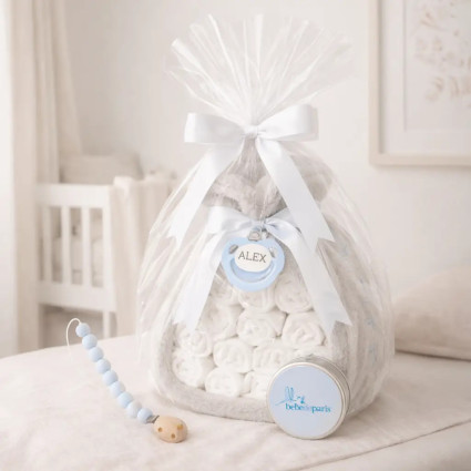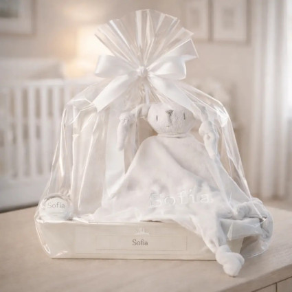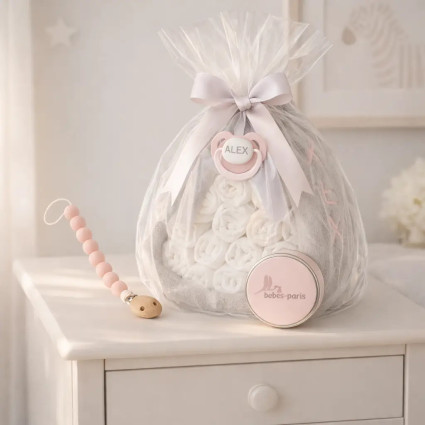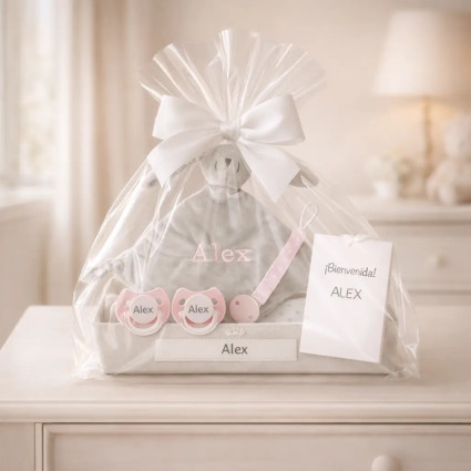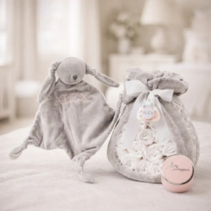 Balíček doudou a 2 personalizovaných dudlíků se jménem dítěte se šňůrkou na dudlík