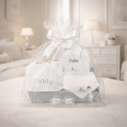 Koš dětského nádobí s muselínem, doudou a osobními doplňky